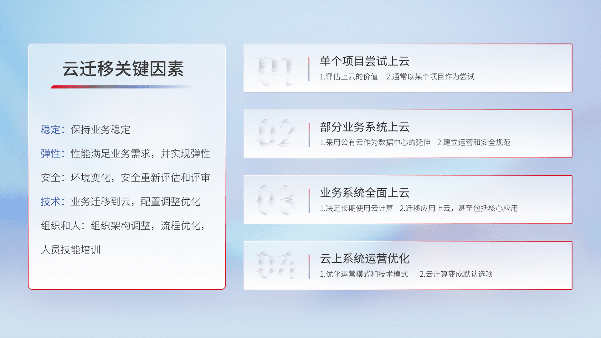 结合实际业务,,,从规划设计、、云平台选型、、、云原生改造、、数据迁移、、、、集成交付,,迁移全过程为客户识别最佳上云路径,,,,做好风险识别管理,,,设计网络架构、、、、身份权限、、、、安全审计合规、、操作审计、、日志审计、、监控告警策略、、、、多站点容灾设计等,,,,对云上基础设施进行整体规划,,,提升IT治理水平,,,,以满足弹性、、、、高可用、、、、高性能的需求。。。