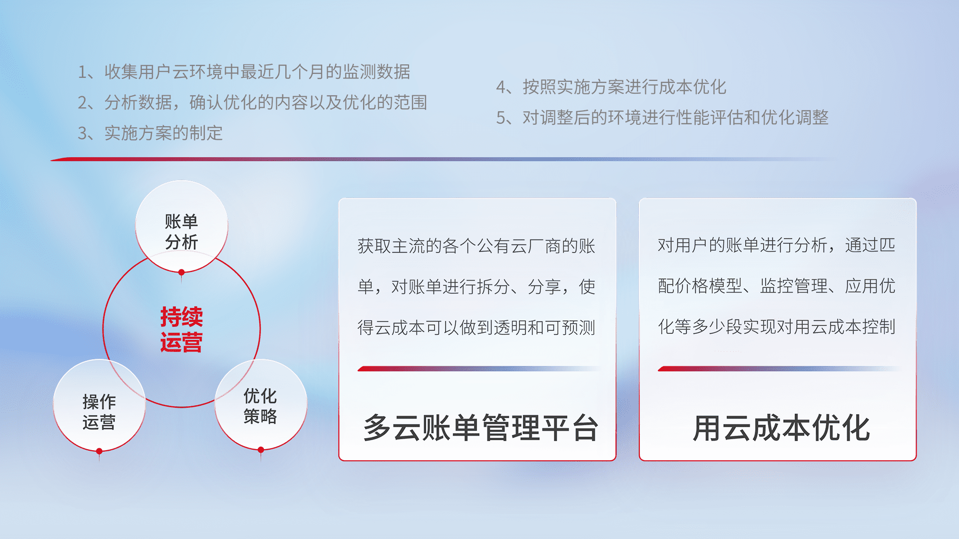 通过多云纳管,,以统一的资源数据模型把客户的云资源进行抽象和封装,,进而实现对多云资源的统一操作,,,,保障云资源管理的可靠性、、、稳定性与可用性。。量身定制化运维内容,,,,配置、、、、开发运维、、补丁管理、、、备份、、监控、、、、认证和访问管理、、、、审计和日常巡检等,,,保障在用云过程中的可靠度,,稳定度以及高可用率。。。